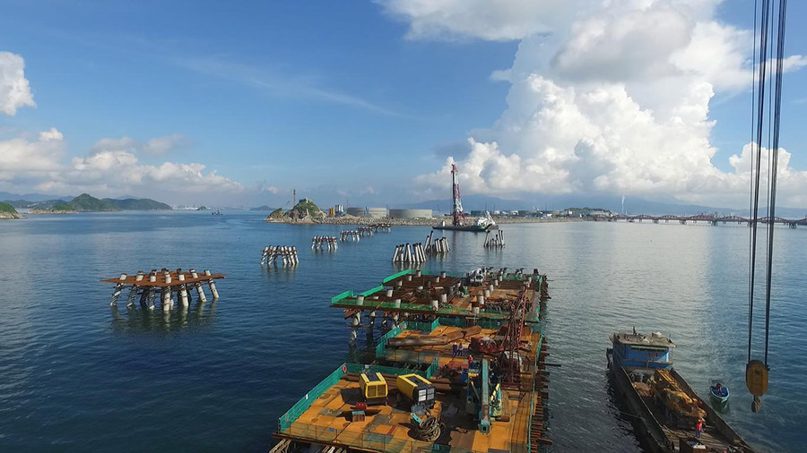 (一)燃料油調和配送中心項目 擬建庫容為115萬立方米罐區。其中: 1.重油罐組60萬立方米:6座10萬立方米(80m×21.8m)儲罐。 2.燃料油罐組(調和罐)40萬立方米:8座5萬立方米(60m×19.3m)儲罐。 3.重柴油罐組15萬立方米:5座3萬立方米(44m×21.78m)儲罐,1座3萬立方米拱頂儲罐。 庫區油品年周轉量為1200萬噸,重油、重柴油、燃料油年周轉次數分別為17次、16次、30次。 (二)配套碼頭工程項目 配套碼頭設計總吞吐能力為2405萬噸/年。建設一個30萬噸級油接卸船碼頭(30萬噸級泊位長度470m),和三個2萬噸級燃料油出運碼頭(三個2萬噸級泊位總長665m,寬20m)以及相應配套設施。 (三)35KV升壓變電站及海底電纜 本項目建設35KV升壓變電站(1×12.5MVA)一座及敷設海底電纜總長約16km(含6km陸域電纜),為燃料油調合配送中心及碼頭生產提供電力。